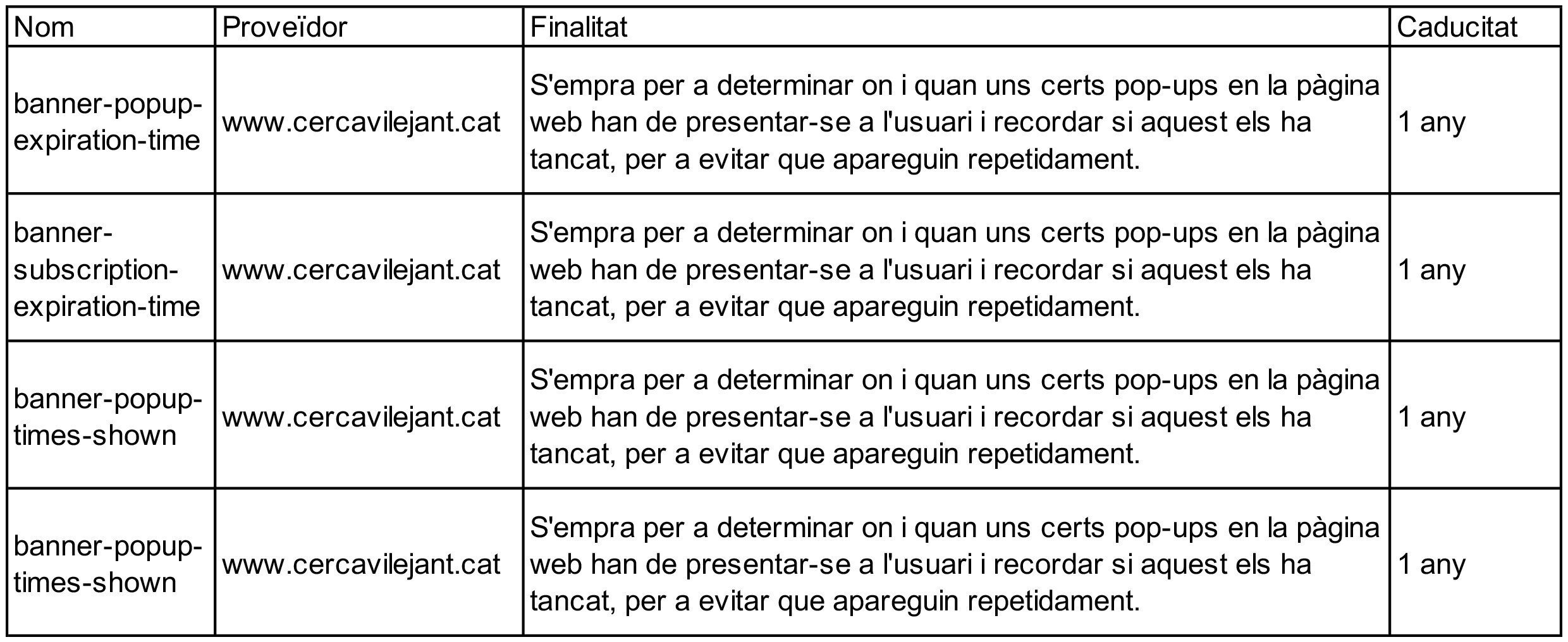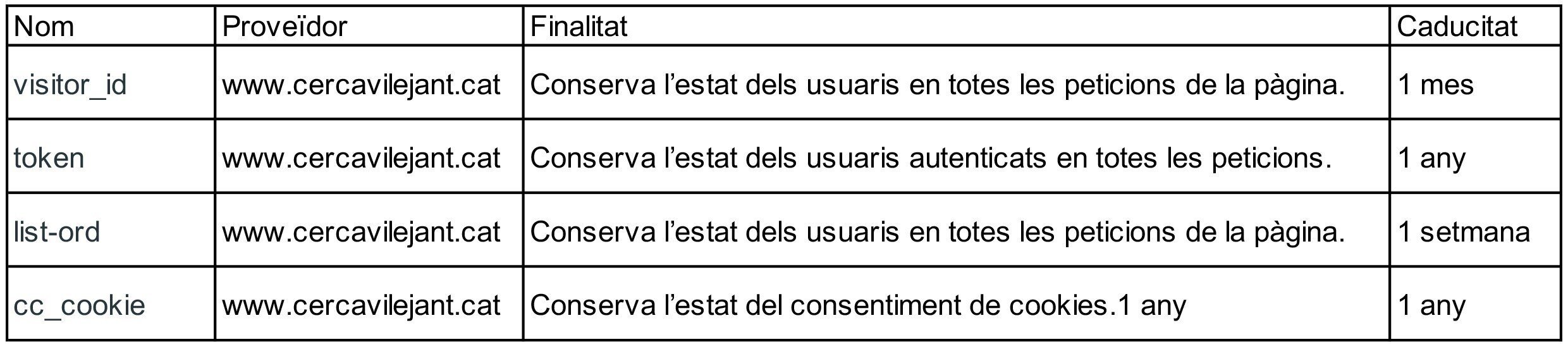 A continuació pots consultar una llista de les cookies utilitzades al Lloc Web: